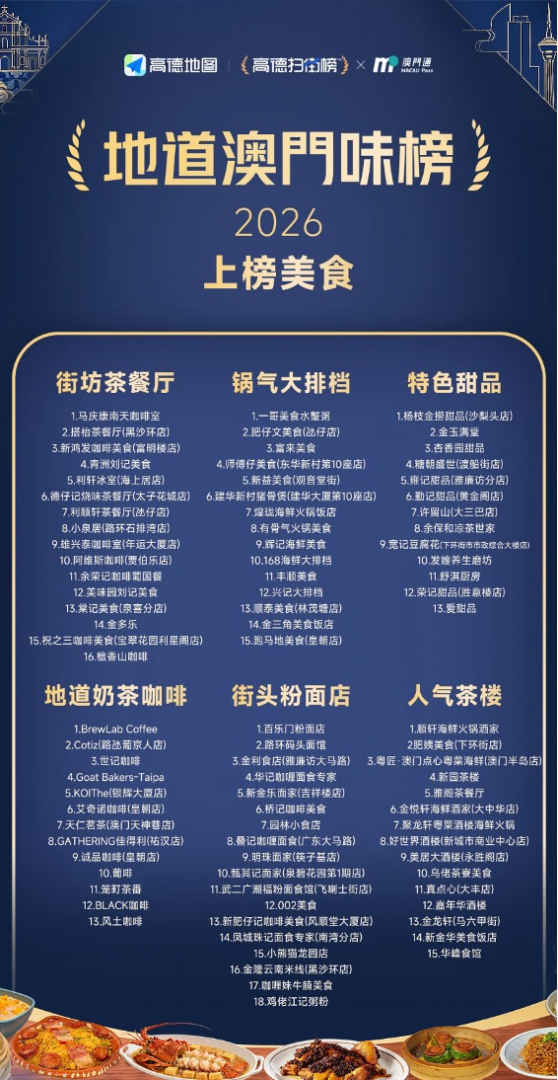 目前,高德扫街榜在澳门已覆盖985家优质门店,其中有96家美食店铺、景点及酒店入选“状元榜”。此次上线的“地道澳门味”榜单,上榜商家共90家,涵盖人气茶楼、特色甜品、锅气大排档等六大类别。该榜单已整合至“跟着扫街榜游澳门”专题页。